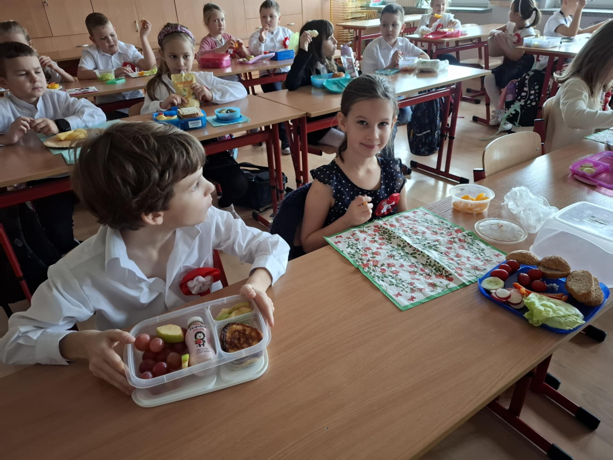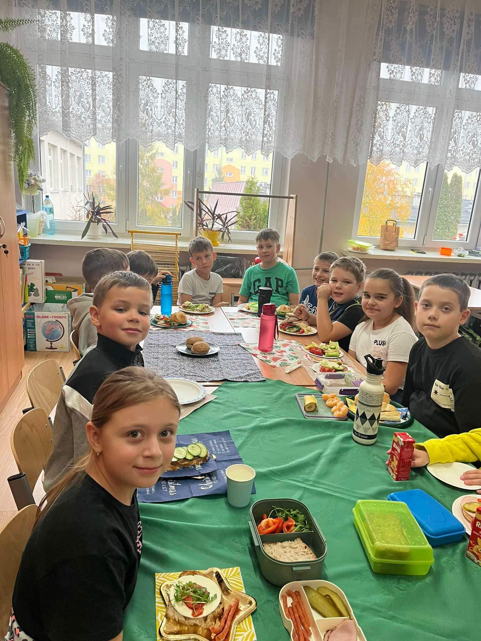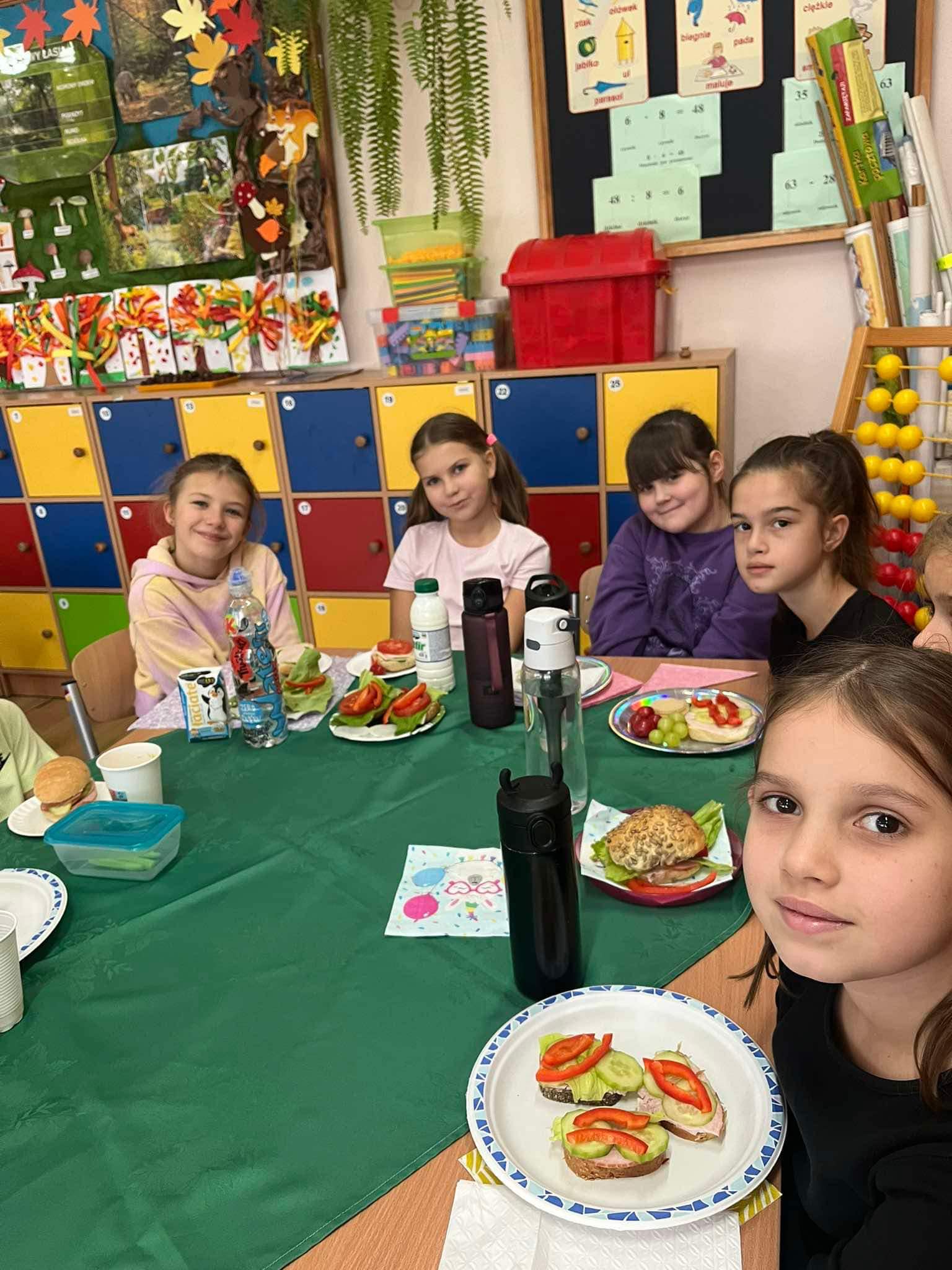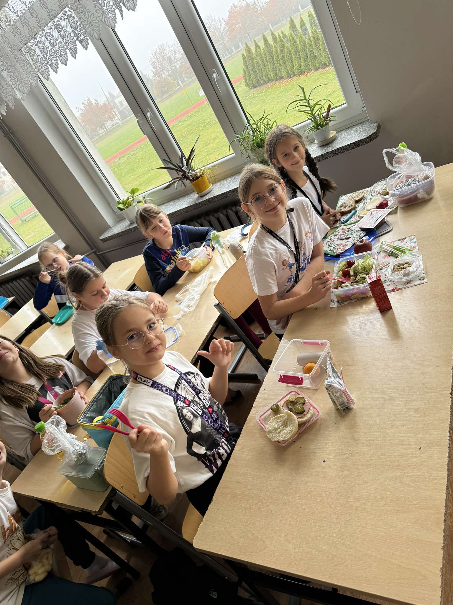 W piątek 8 listopada uczniowie i nauczyciele wspólnie spożywali śniadanie. Były to kolorowe kanapki z pełnoziarnistego pieczywa, warzywa, owoce, sałatki, owsianki, soki ze świeżych owoców i warzyw.