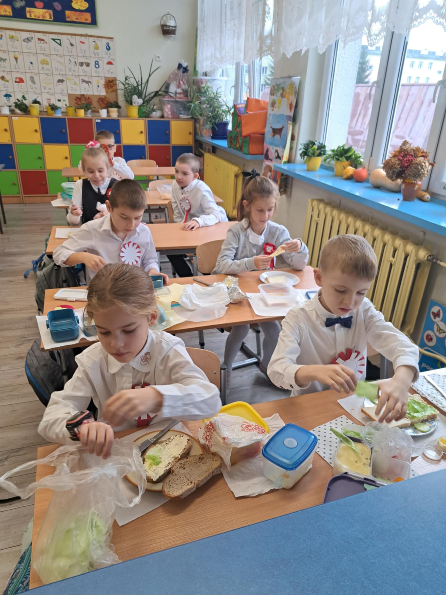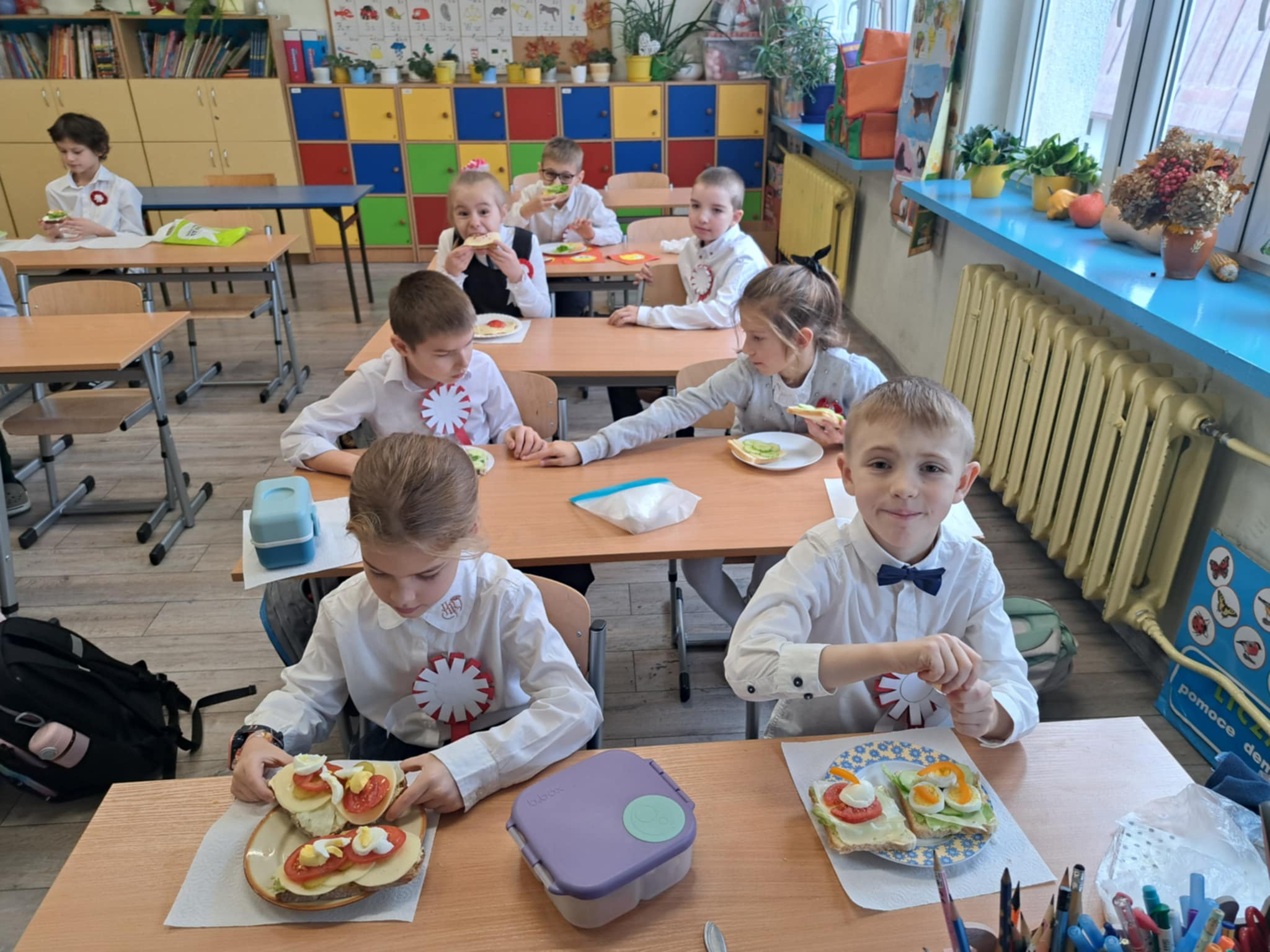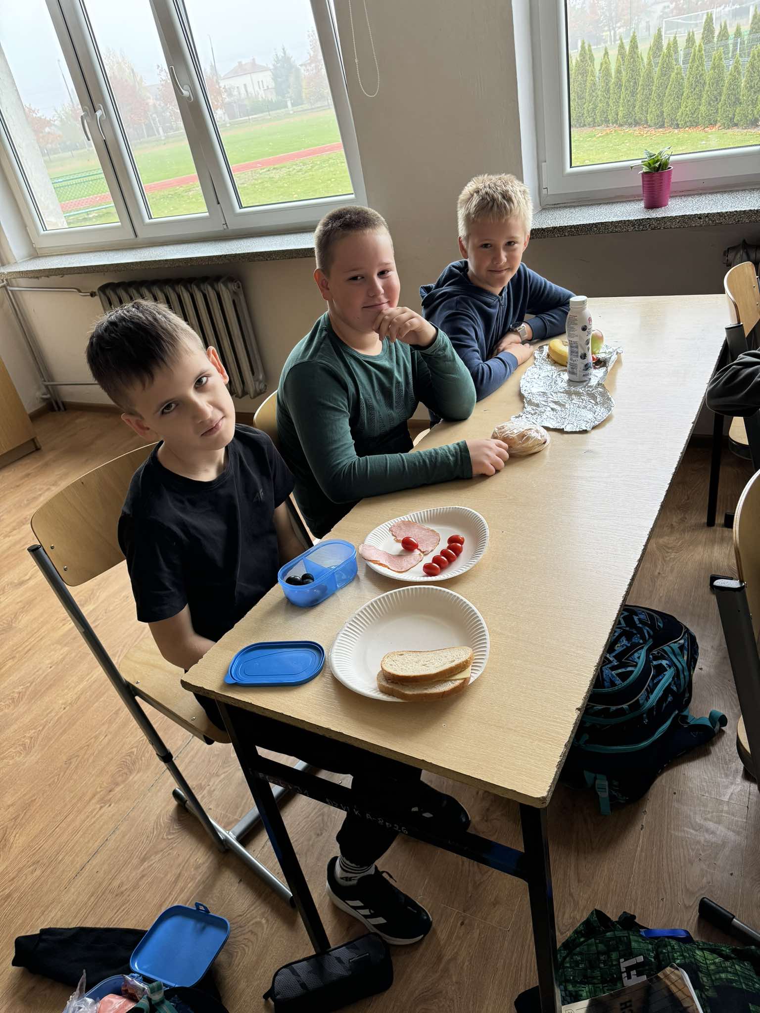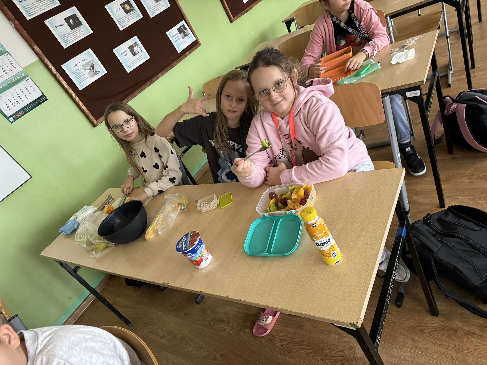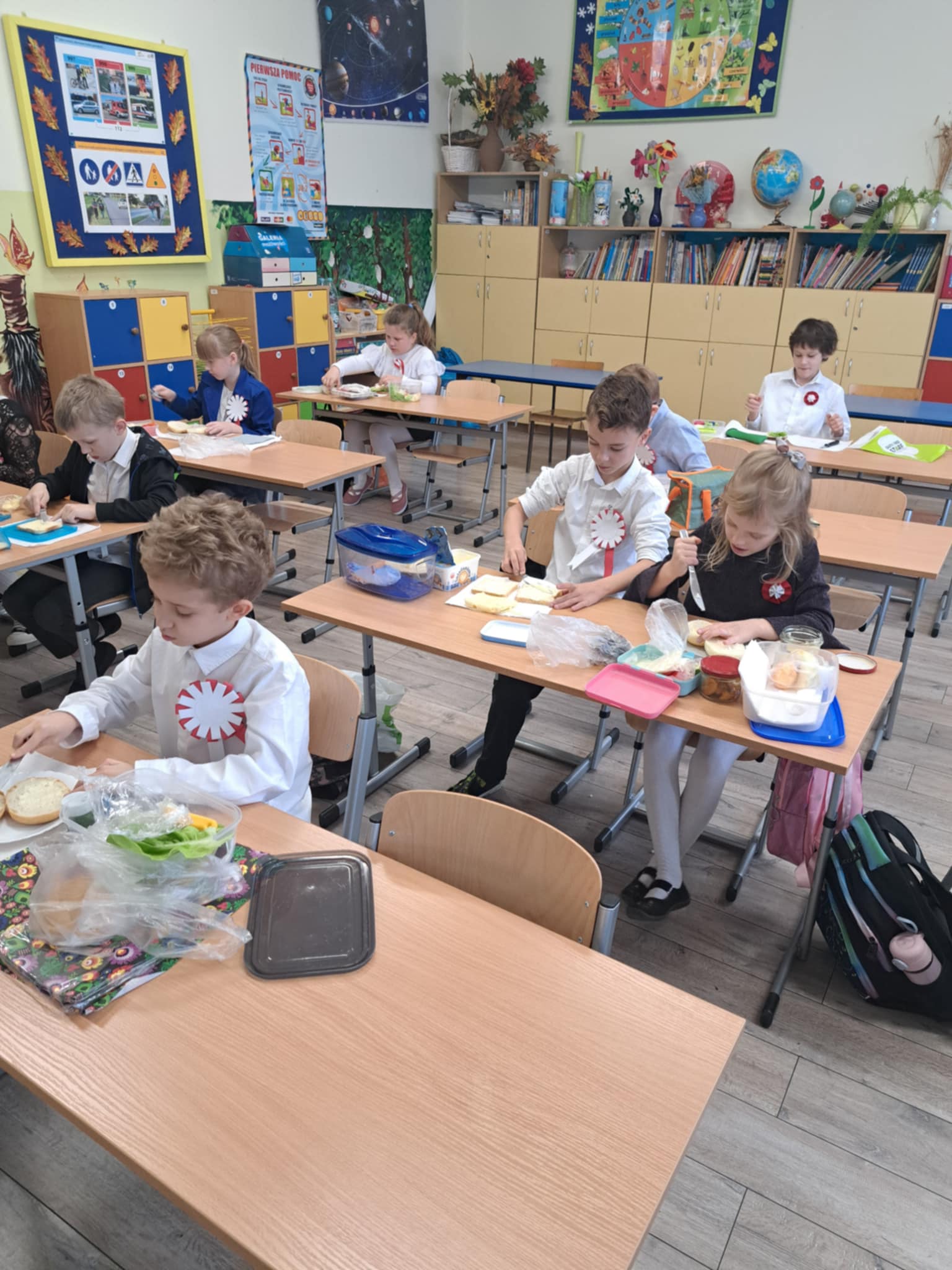 W piątek 8 listopada uczniowie i nauczyciele wspólnie spożywali śniadanie. Były to kolorowe kanapki z pełnoziarnistego pieczywa, warzywa, owoce, sałatki, owsianki, soki ze świeżych owoców i warzyw.