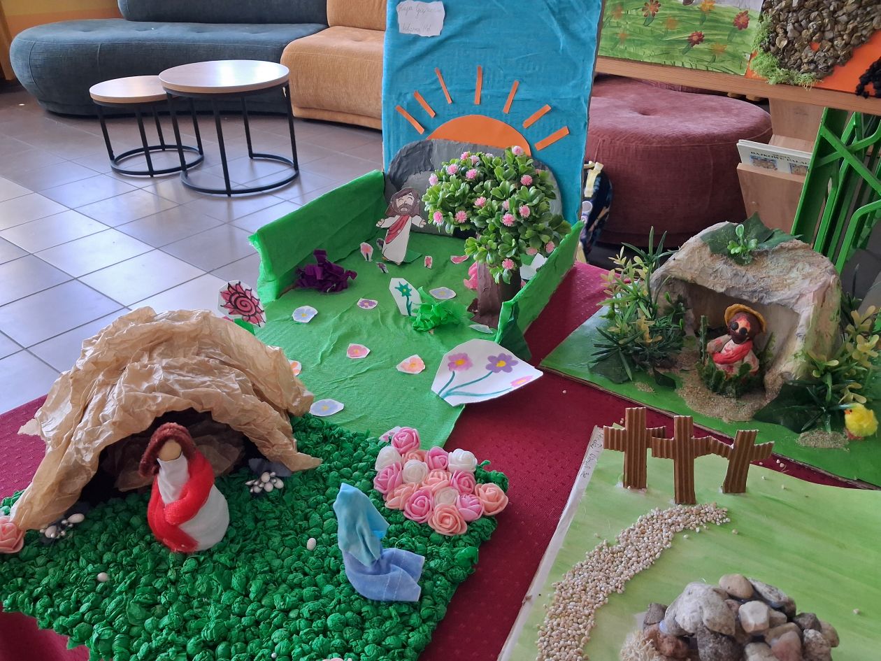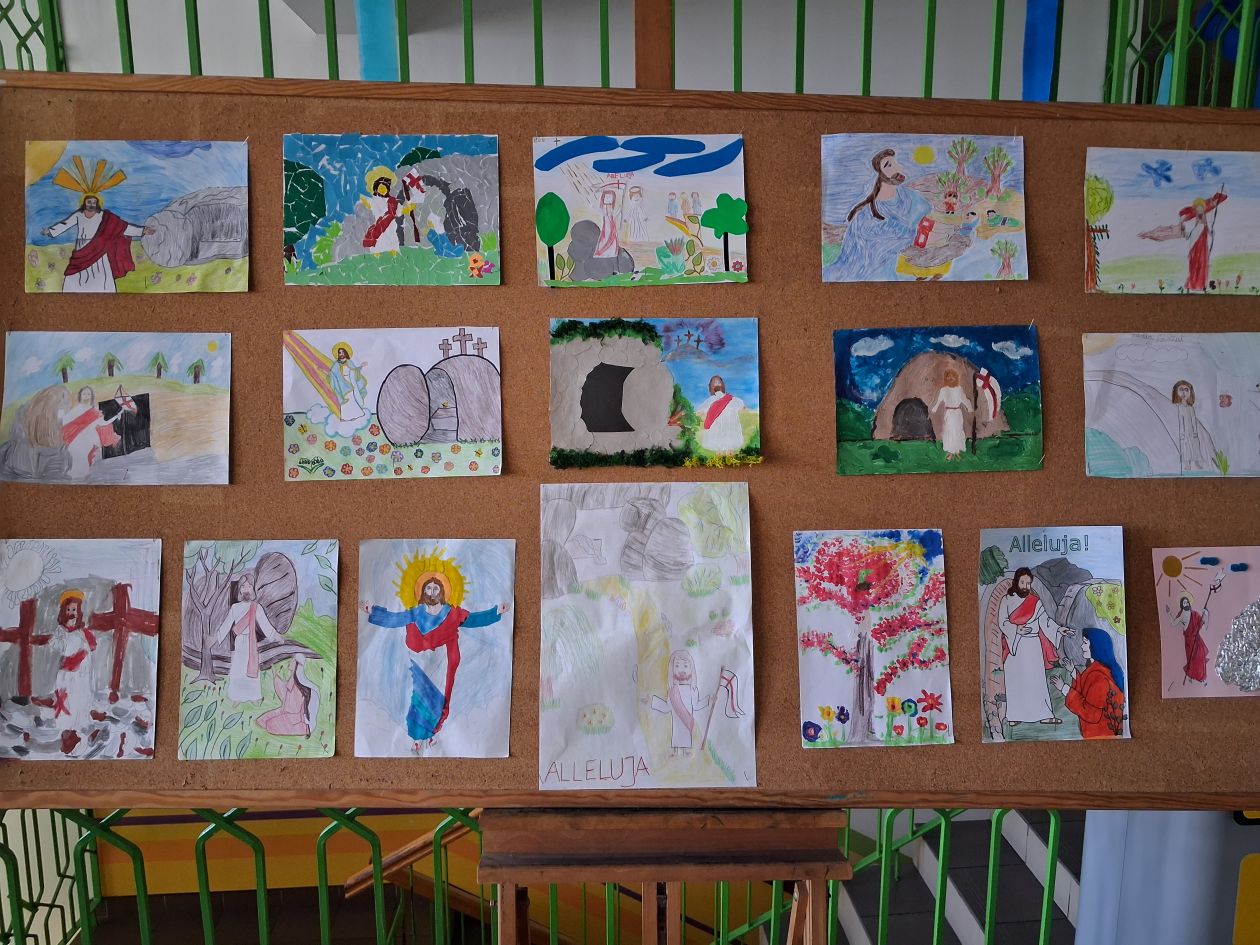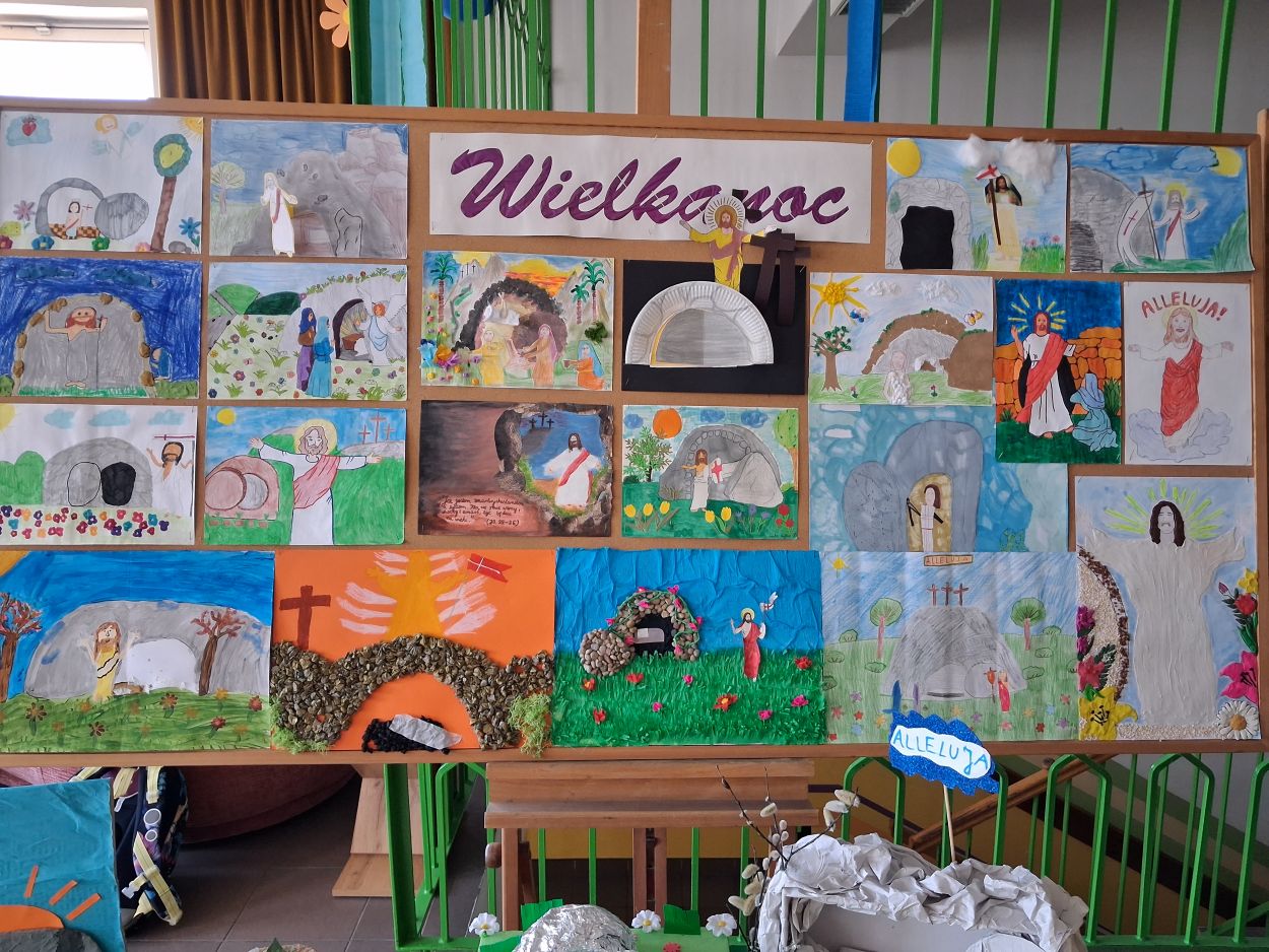 W kwietniu 2025 panie P. Matoszuk i D Hładoniuk przeprowadziły wśród uczniów klas I – IV wielkanocny konkurs plastyczny pt.: „Jezus żyje”.