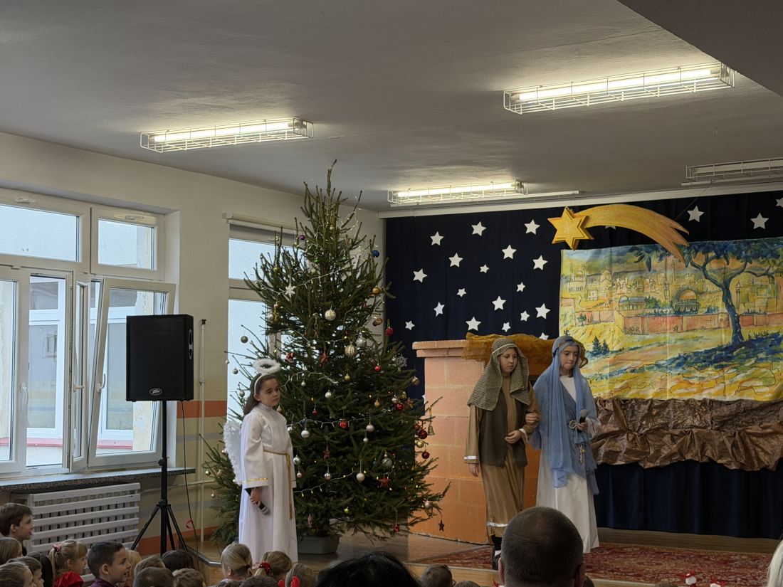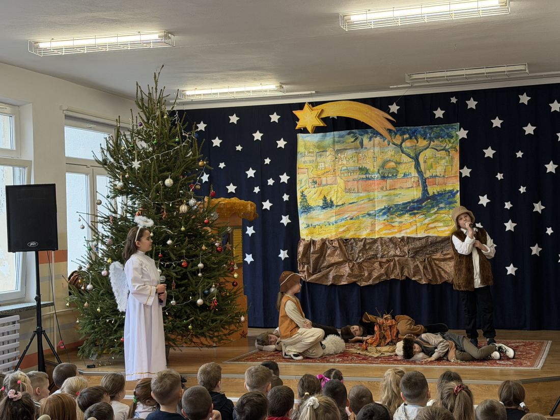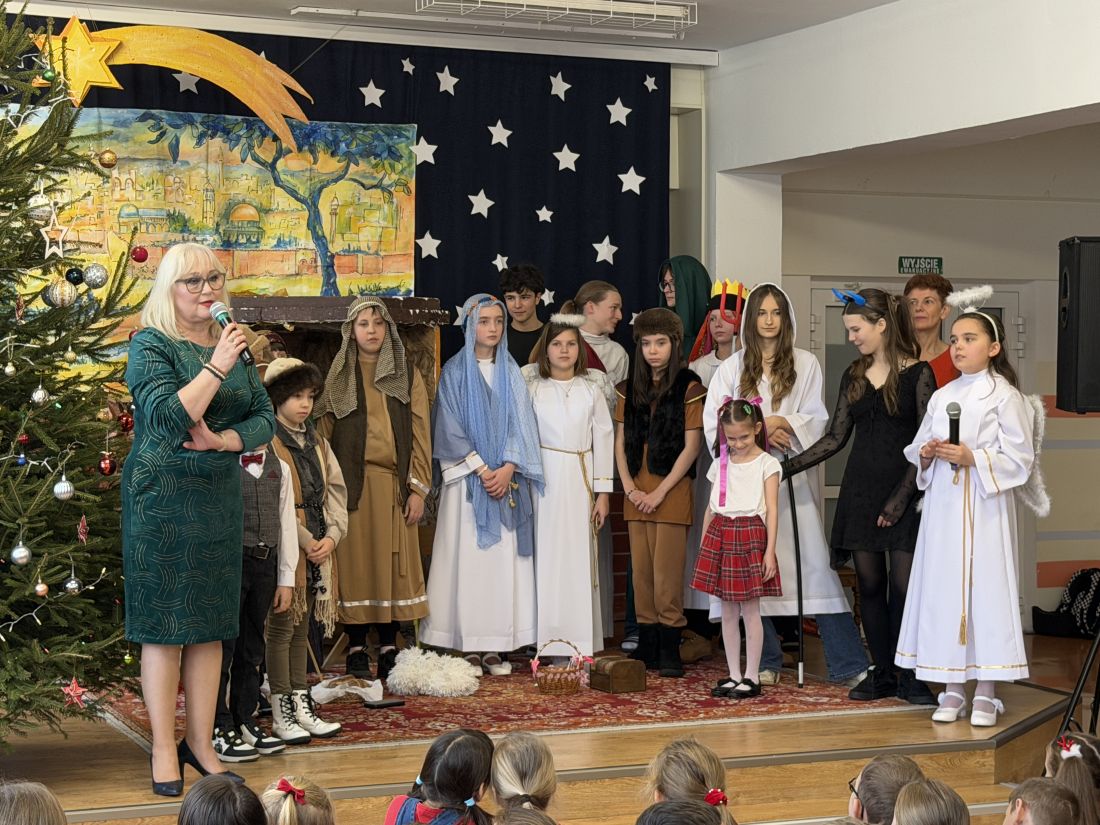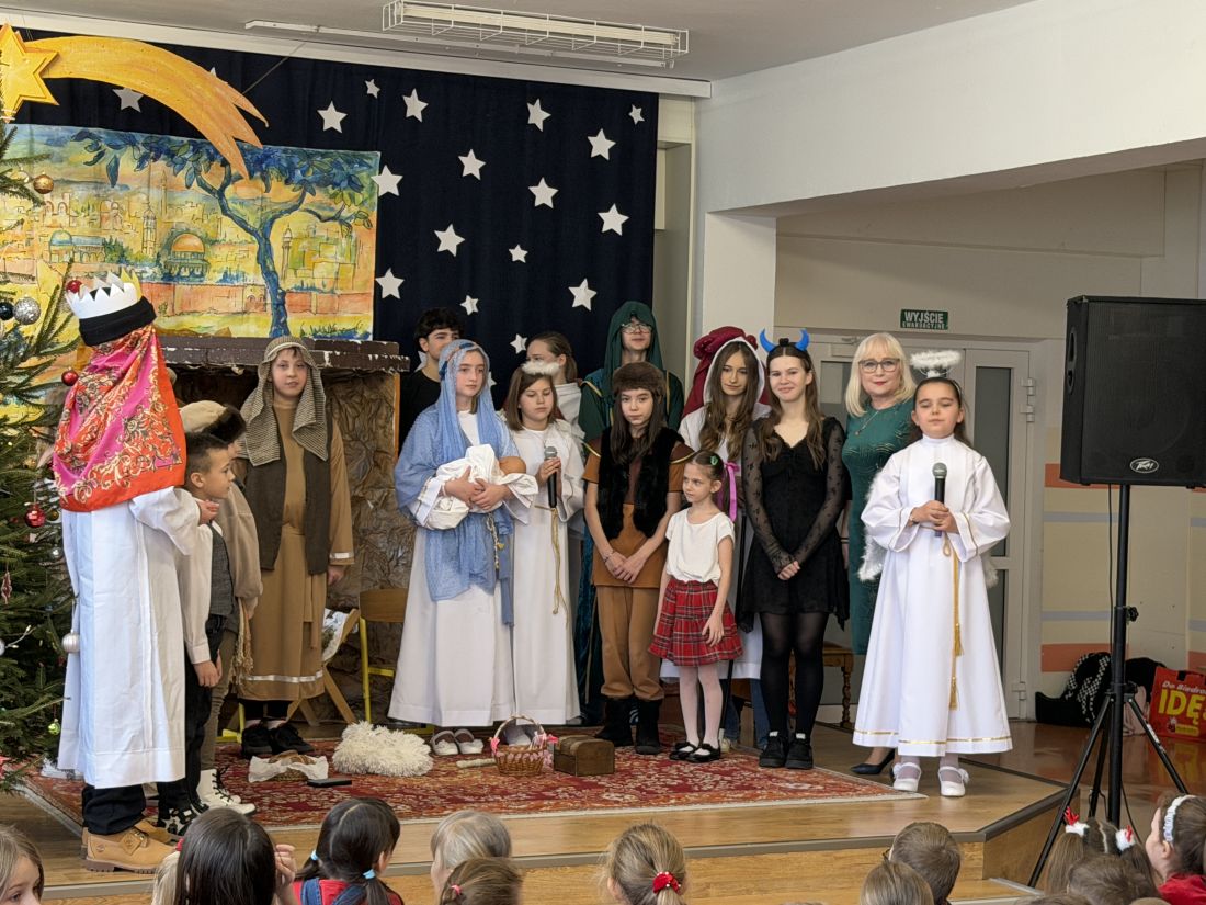 Pani katechetka P. Matoszuk wraz z dziećmi z klasy 4a 4d, 8d, Ib przygotowała Jasełka Bożonarodzeniowe pt.: „W drodze do Betlejem”. Pani zadbała również o oprawę muzyczną i dekorację sceniczną. Jasełka zostały wystawione dwukrotnie uczniom klas I - VIII i nauczycielom naszej szkoły w piątek 19.12.2025r. na 3 i 4 godzinie lekcyjnej (scena – hol E) podczas wigilijnych spotkań klasowych. Po przedstawieniu pani dyrektor B. Mikołajczak złożyła wszystkim dzieciom i pracownikom szkoły życzenia z racji Świąt Narodzenia Pańskiego.