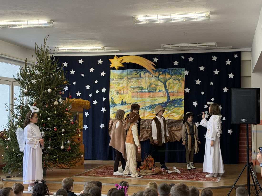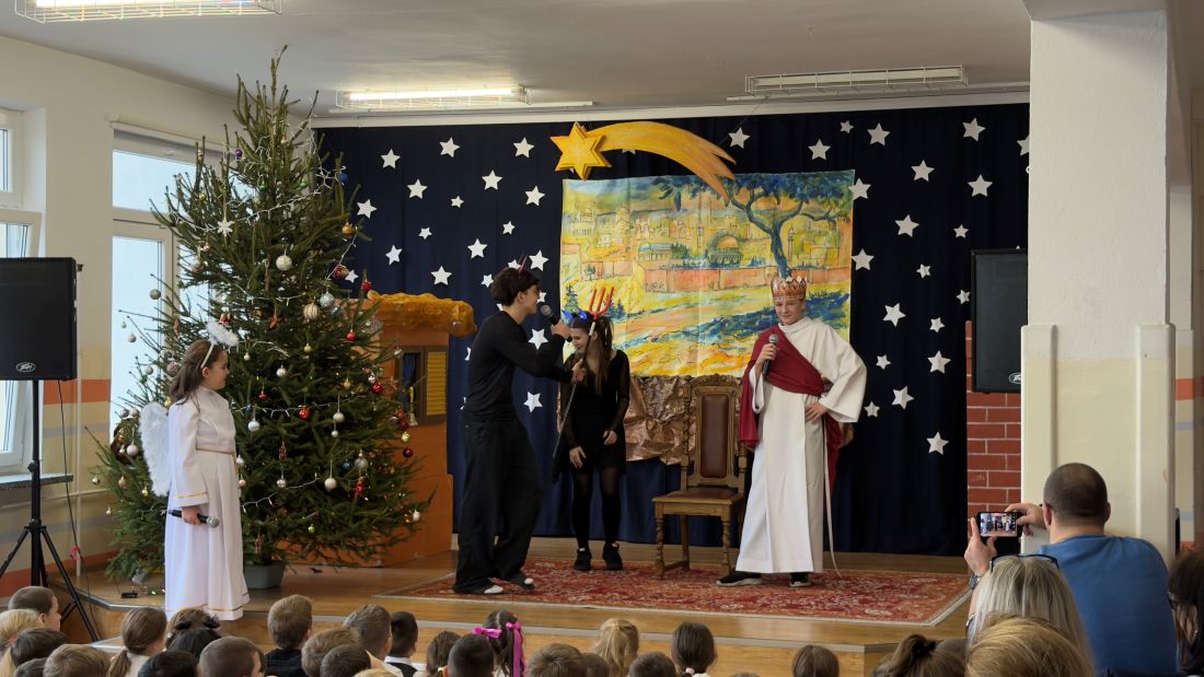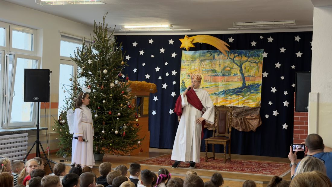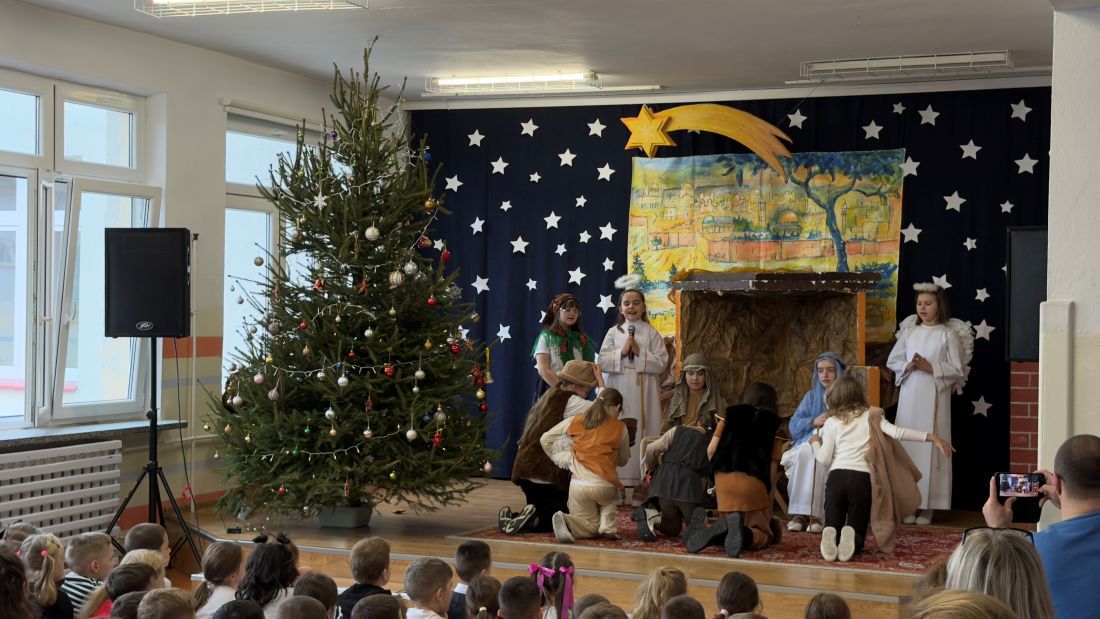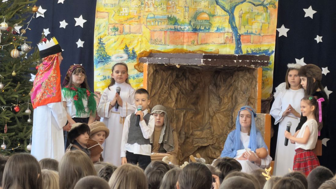 Pani katechetka P. Matoszuk wraz z dziećmi z klasy 4a 4d, 8d, Ib przygotowała Jasełka Bożonarodzeniowe pt.: „W drodze do Betlejem”. Pani zadbała również o oprawę muzyczną i dekorację sceniczną. Jasełka zostały wystawione dwukrotnie uczniom klas I - VIII i nauczycielom naszej szkoły w piątek 19.12.2025r. na 3 i 4 godzinie lekcyjnej (scena – hol E) podczas wigilijnych spotkań klasowych. Po przedstawieniu pani dyrektor B. Mikołajczak złożyła wszystkim dzieciom i pracownikom szkoły życzenia z racji Świąt Narodzenia Pańskiego.