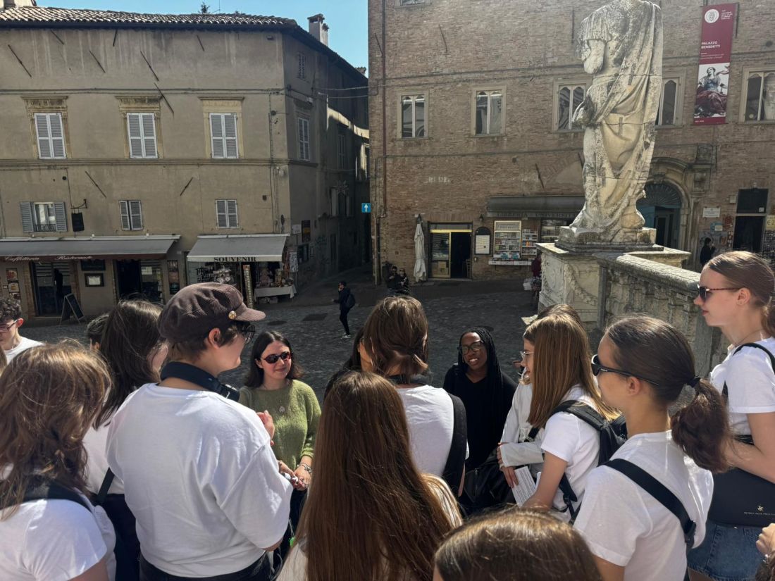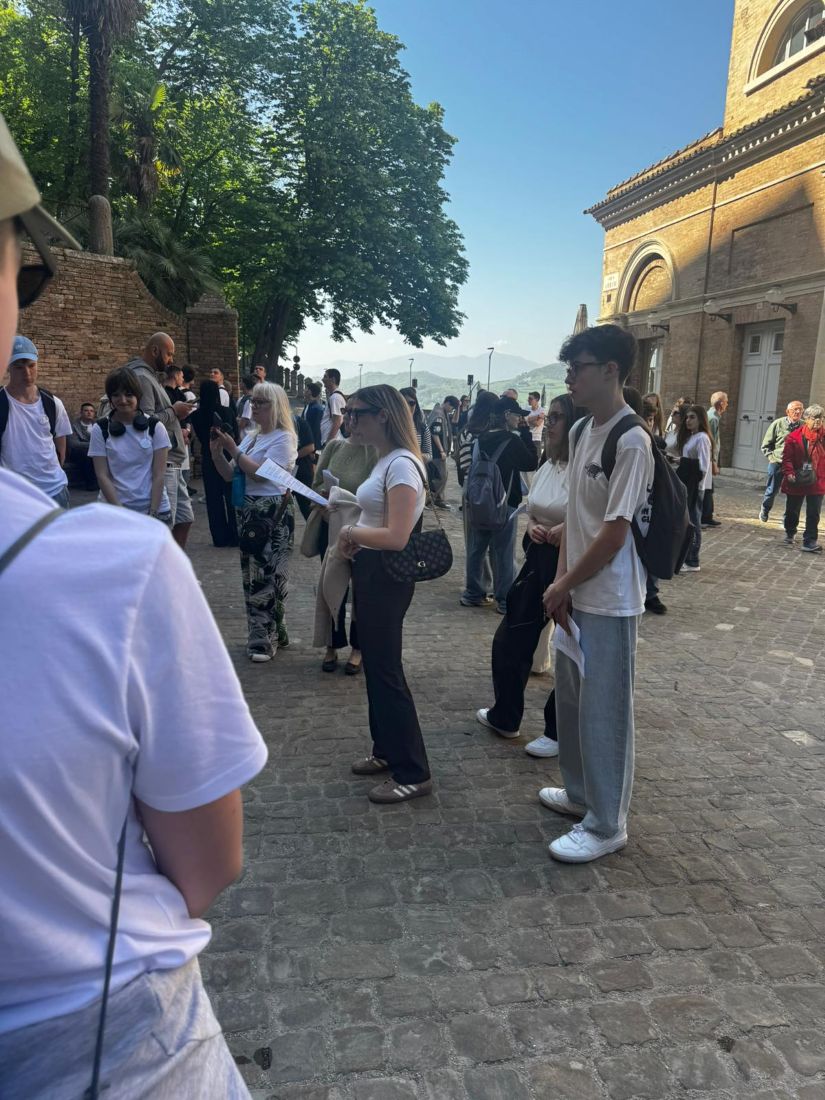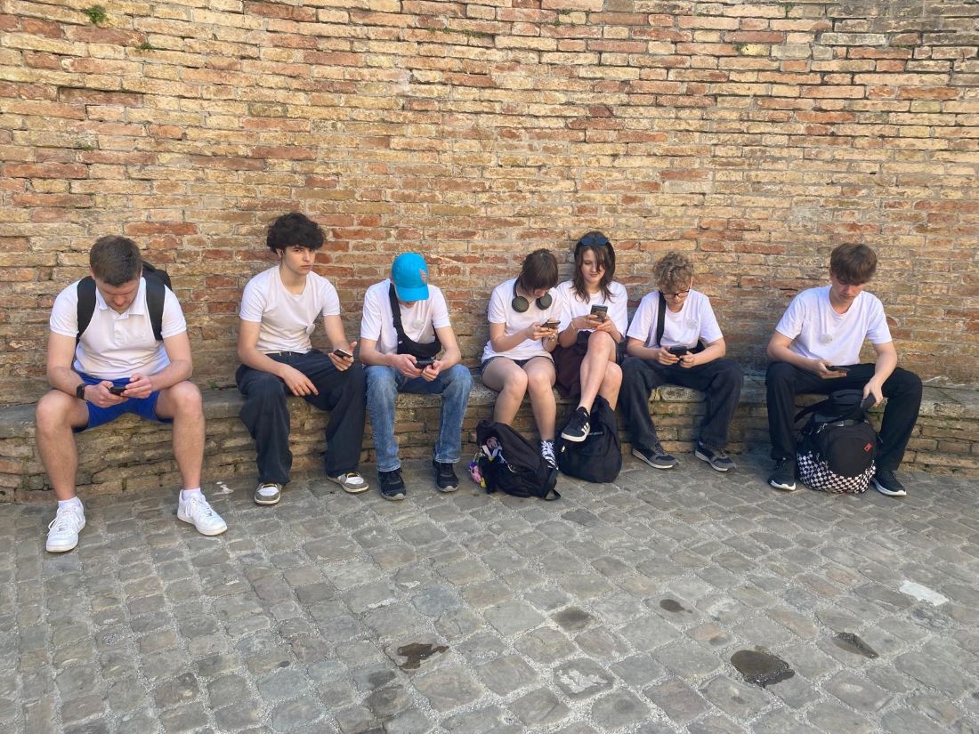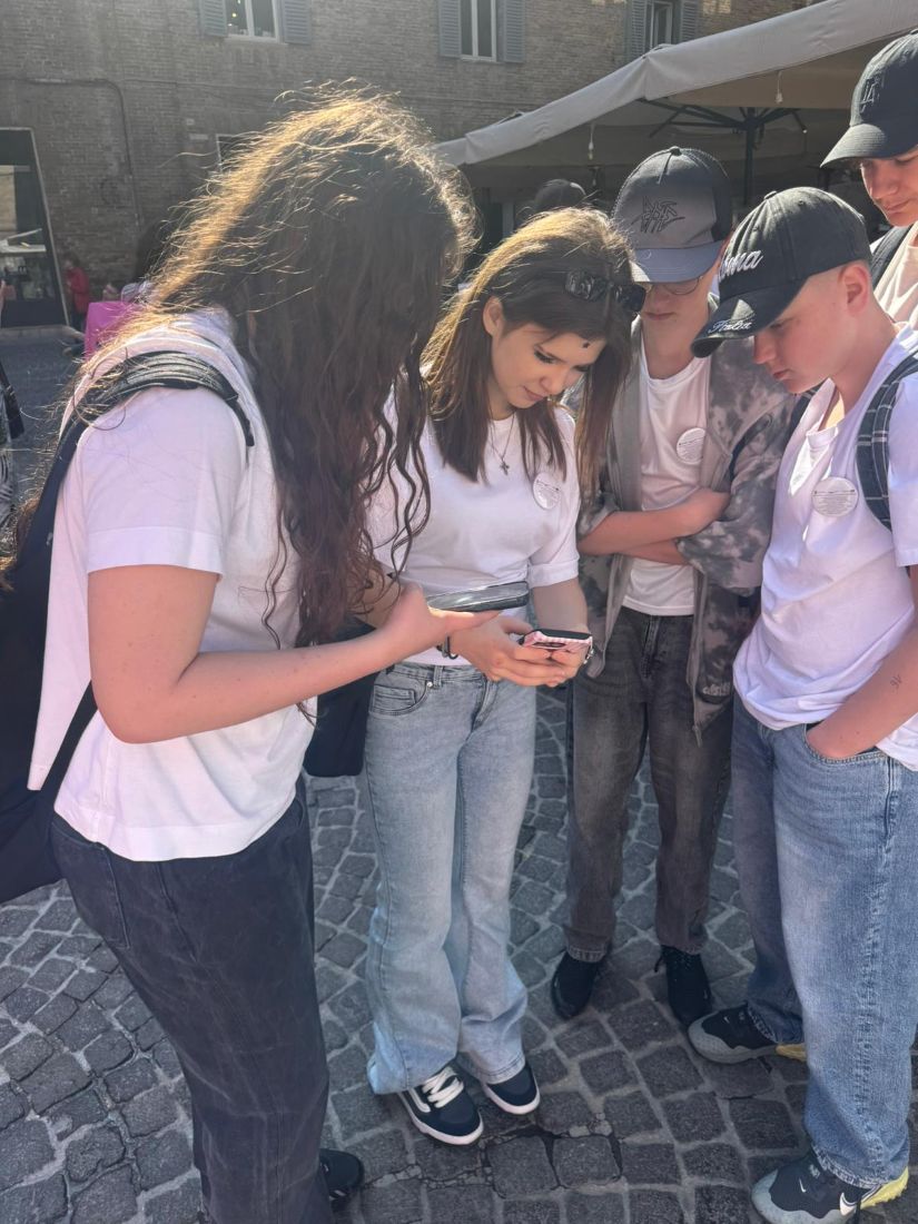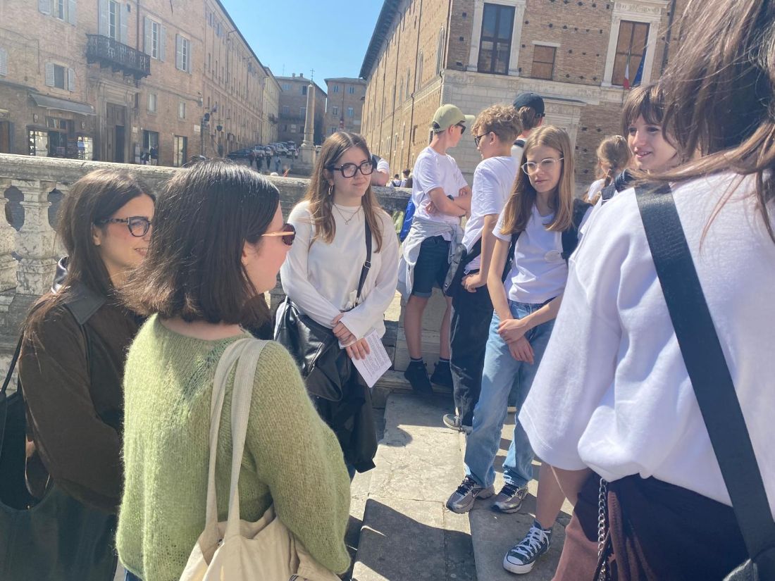 W piątek 17 kwietnia odwiedziliśmy urocze miasteczko Urbino we włoskim regionie Marche. Tam spotkaliśmy się z uczniami 👨🏼‍🎓🧑🏼‍🎓 Liceum o profilu turystycznym oraz ich nauczycielka 👩‍🏫 włoska młodzież opowiedziała nam o swojej szkole 🏫📓📝 mieliśmy też szansę zadać kilka pytań w języku angielskim aby dowiedzieć się jakie egzaminy zdają nasi włoscy przyjaciele, jakich uczą się przedmiotów i jak wygląda ich typowy dzień w szkole👨‍🏫🏫 następnie licealiści oprowadzili nas po Urbino i opowiedzieli o jego najważniejszych zabytkach ⛪️🏰 punktem końcowym naszej wizyty było wyszukiwanie ciekawostek na temat Urbino z wykorzystaniem narzędzi internetowych 🛜🤳📱 ten dzień dał na okazję do: